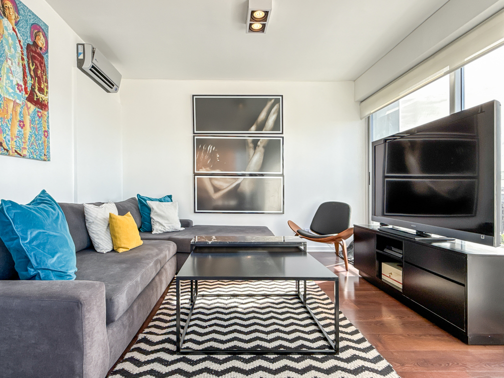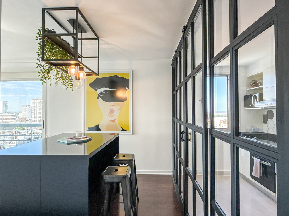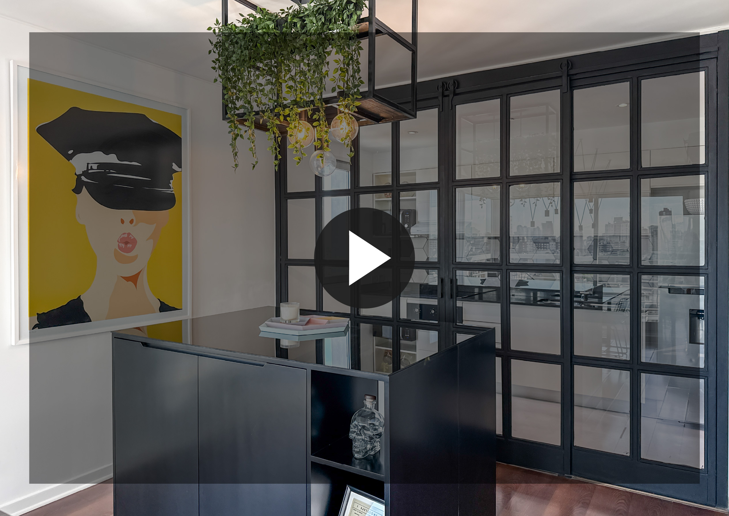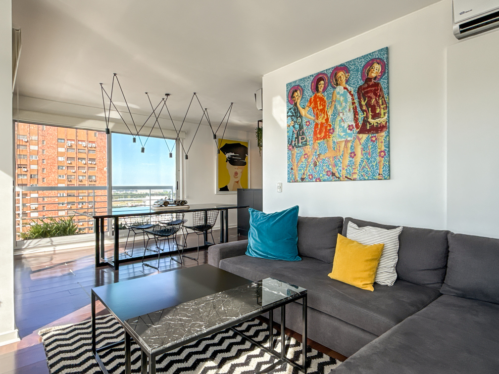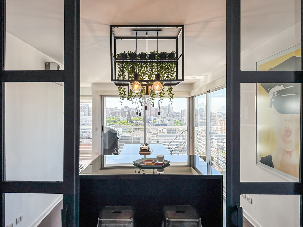 Departamento en Canitas donde los espacios del living, comedor, cocina son flexibles. La cocina puede integrarse o estar cerrada, las puertas en hierro y vidrio crean una conexion fluida entre los espacios. El interiorismo es de lineas modernas y colores monocromaticos, mientras que el arte le da personalidad y refuerza lo elegido. Un equilibrio entre funcionalidad, innovacion y estilo.